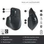 Specifications Of Logitech MX Master 3S with Free Adobe Subscription – Wireless Performance Mouse with Ultra-Fast Scrolling, Ergo, 8K DPI, Track on Glass, Quiet Clicks, USB-C, Bluetooth -Graphite